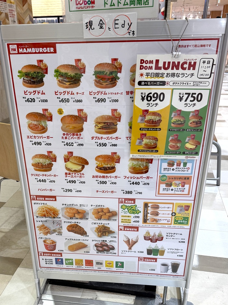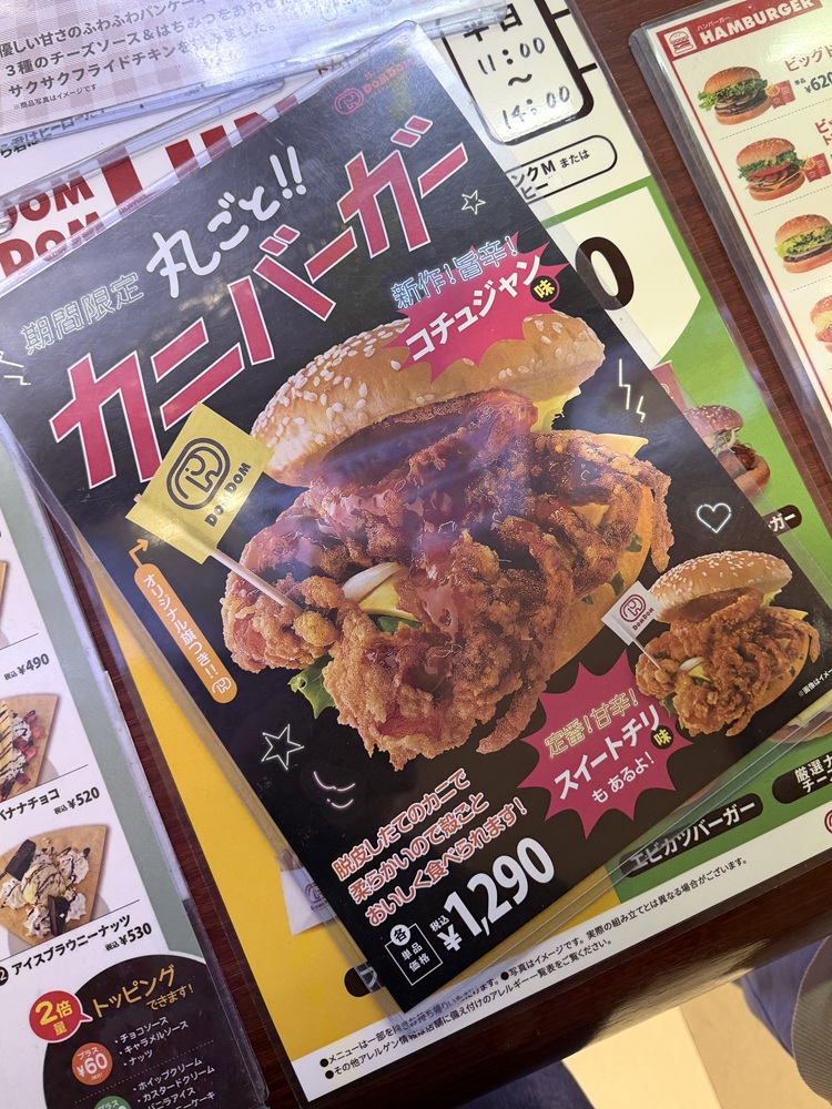 Domdom Hamburger - Konan Fc in Okayama offers a variety of mouth-watering options for those craving a satisfying meal. Their menu stands out with unique creations such as the びたびたバターフィッシュ, a flavorful fish burger drenched in butter, providing a rich and indulgent experience. For a more earthy twist, the まいたけバーガー combines the savory taste of maitake mushrooms in a hearty patty. One of the best value picks is the ビッグドム m セット, which features their signature Big Dom burger paired with a side and drink. Seafood lovers will enjoy the 丸ごと カニバーガー, a whole crab burger that’s both fresh and flavorful, or opt for the カニバーガー sセット for a smaller yet equally satisfying portion. The 照り焼き burger brings a touch of Japanese sweetness with a teriyaki glaze that’s perfectly balanced. Fans of classic burgers will appreciate the ビッグドムバーガー チキンナゲット コーヒー, a substantial meal that includes a Big Dom burger, chicken nuggets, and a coffee to wash it all down. For those who prefer a lighter seafood option, the 丸ごとカレイバーガー features a whole flounder in a burger form. The ビッグドム トマト&チーズ adds a deliciously creamy touch with melted cheese and fresh tomato slices. Overall, Domdom Hamburger’s menu provides a great selection of diverse and flavorful dishes that cater to a wide range of tastes, all served with friendly service in a cozy atmosphere.